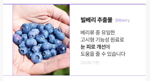 빌베리의 안토시아닌은 강력한 항산화제로 작용하여 체내에 축적된 활성산소 제거에 도움을 줘요.