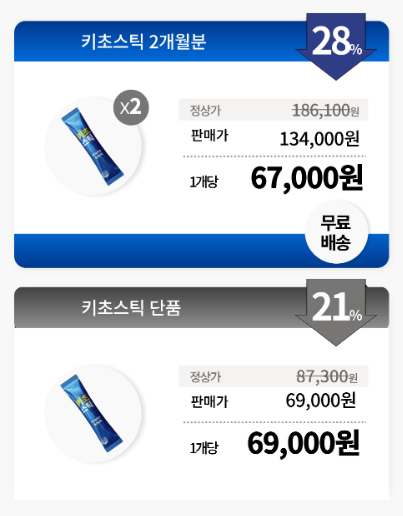 키초스틱의 가격은 공식 판매처 기준으로 1박스당 약 6만원대에 구매하실 수 있어요. 대량 구매 시 좀 더 저렴한 가격에 구매하실 수 있으며, 6개월분 구매 시 1박스당 59000원에 구매하실 수 있어요. 가격대는 조금 있지만, 성장기 아이들의 건강을 생각한다면 충분히 투자할 만한 가치가 있다고 생각해요.