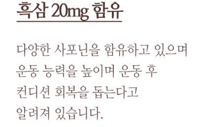흑삼 등에 포함된 사포닌 성부은 운동능력 향상 및 운동 후 회복능력에도 도움을 준다고 알려져 있습니다.
